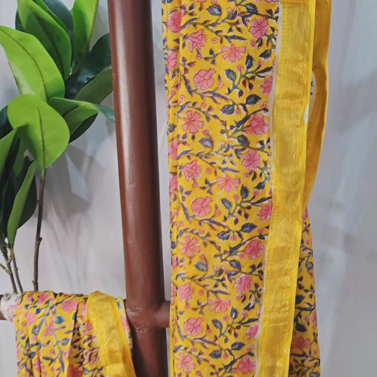 Celebrate festive and party occasions with this Yellow Maheshwari silk saree featuring exquisite hand-blocked prints. The luxurious silk fabric drapes effortlessly, offering all-day comfort. Traditional patterns add cultural richness while maintaining contemporary elegance. Ideal for women who appreciate artisanal craftsmanship and a refined, stylish look that stands out at every event.