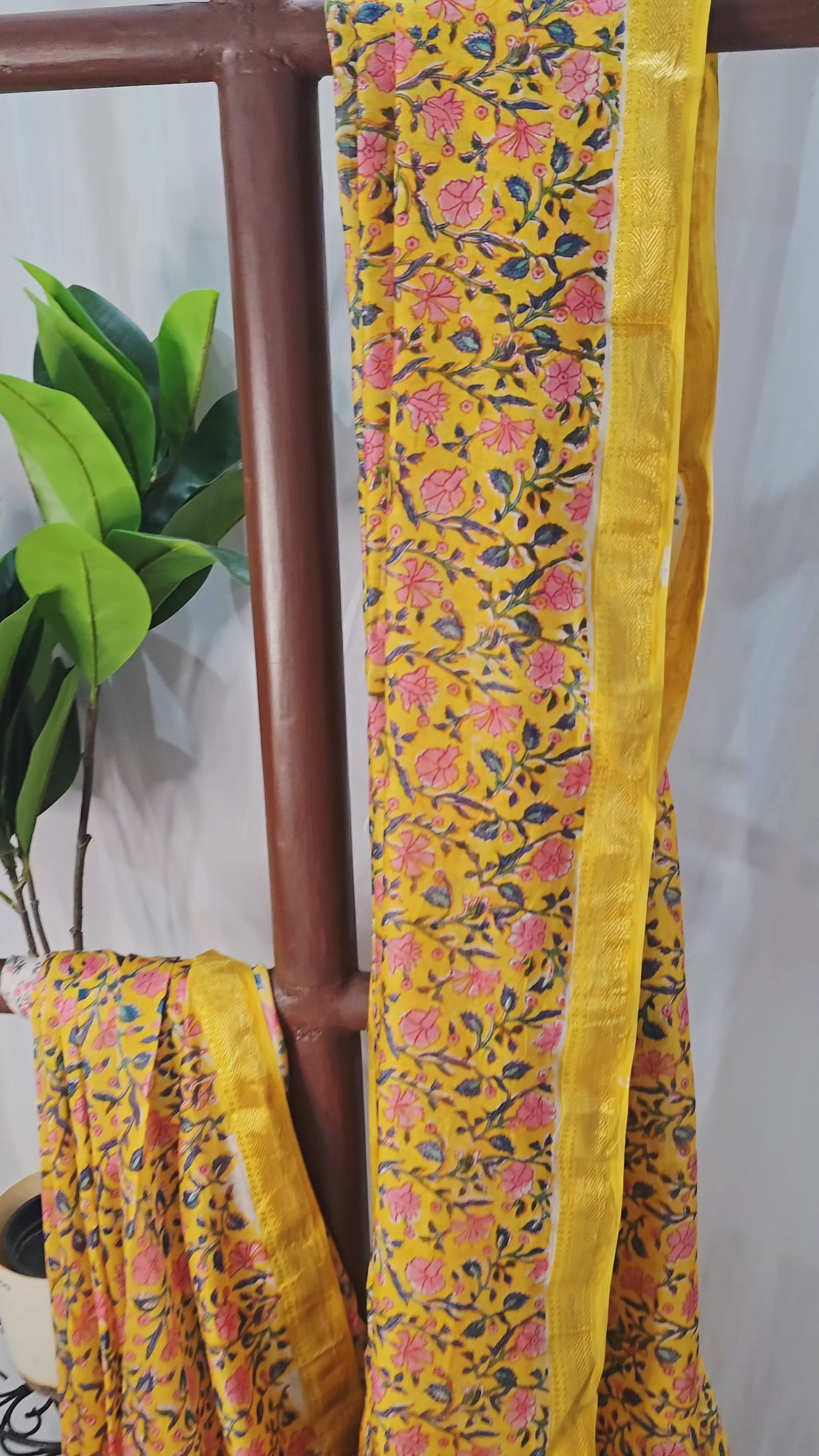 Beautiful Yellow Maheshwari Silk Saree with Hand Block Print for Festive & Party Wear