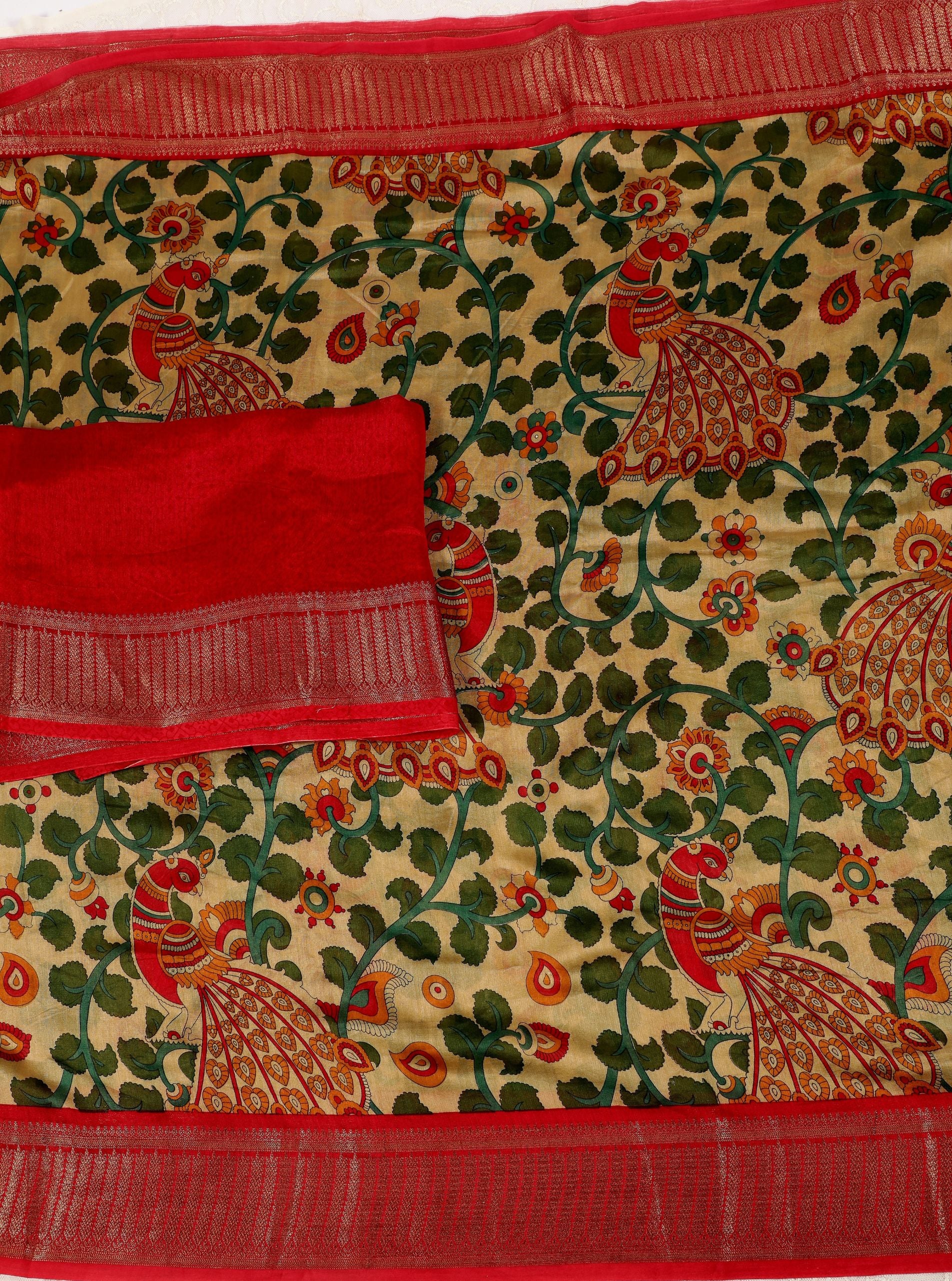 Beige Chanderi Silk Saree with Peacock Kalamkari Print & Red Zari Border