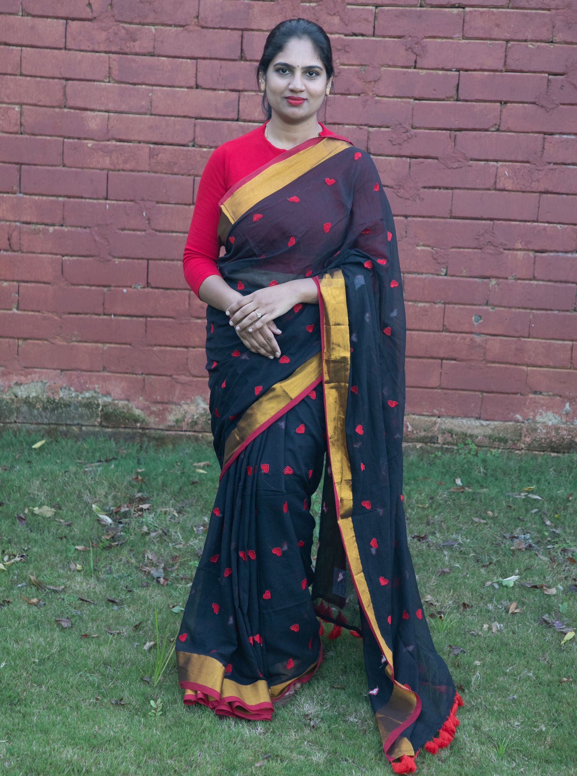 Black Mul Cotton Saree with Red Heart Motifs & Golden Zari Border