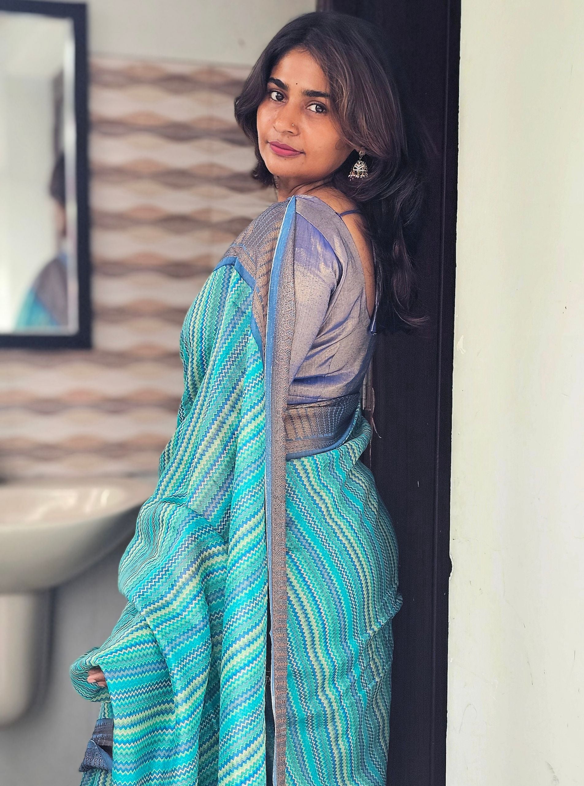 Paired with a matching blue blouse piece, this saree is perfect for festive occasions, temple visits, cultural events, and elegant daytime celebrations.