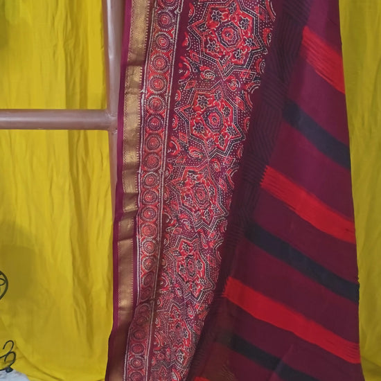 Drape yourself in heritage charm with this maroon Maheshwari silk saree, exquisitely hand block printed by artisans. Its smooth silk texture and subtle sheen radiate timeless appeal, while the handcrafted patterns make every piece unique. Perfect for festive celebrations or evening occasions, it effortlessly combines tradition, luxury, and contemporary sophistication in one elegant ensemble.