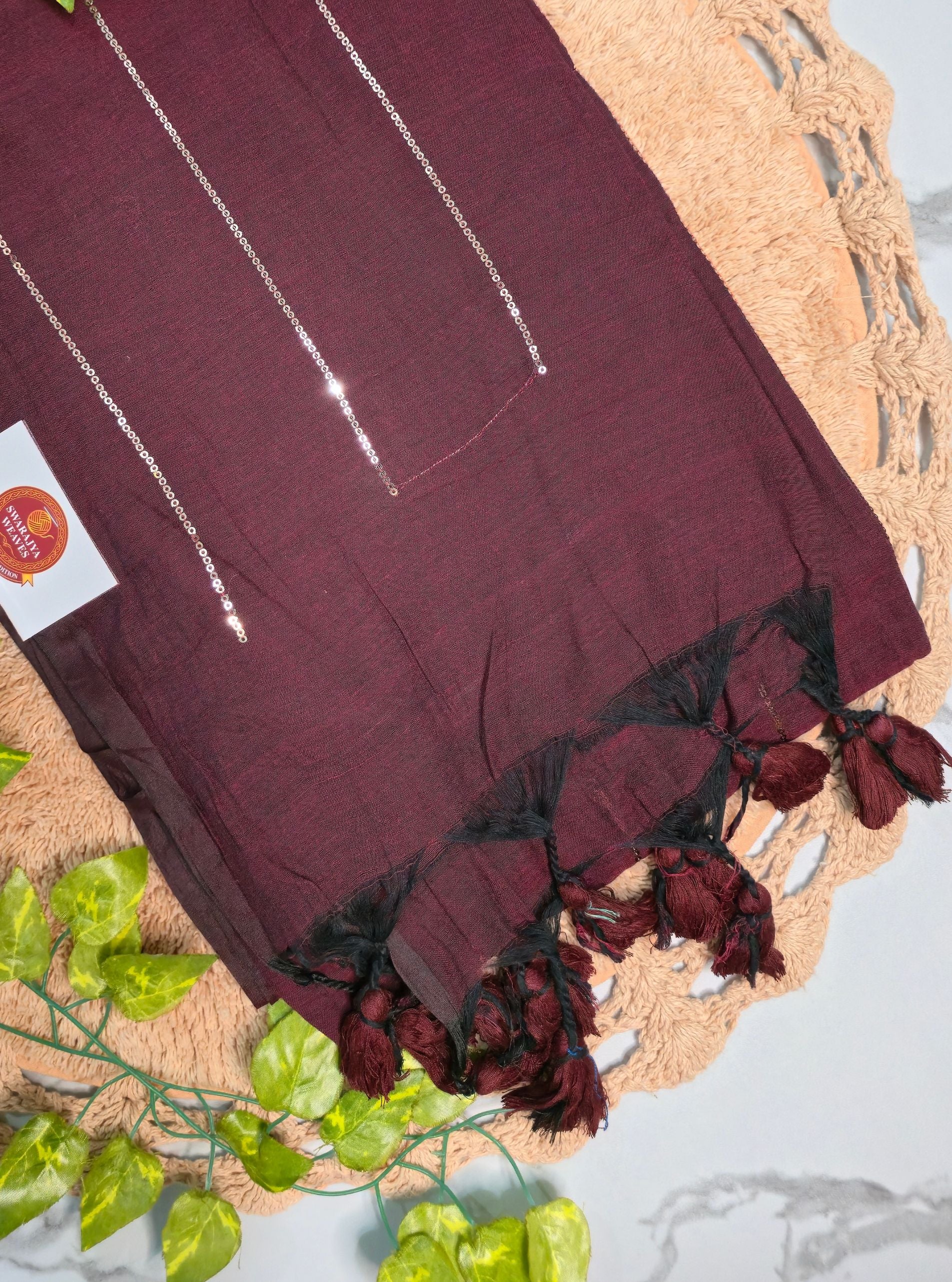 The rich maroon base is enhanced with delicate vertical sequin stripe detailing, adding just the right hint of shimmer while keeping the look minimal and sophisticated. Finished with hand-knotted tassels on the pallu, this saree exudes understated charm and artisanal finesse.