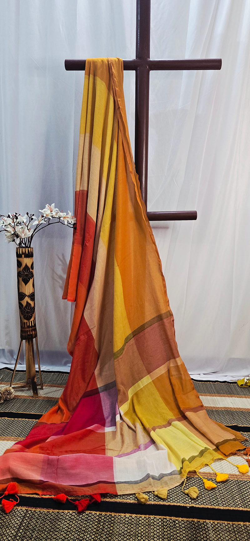 Brighten your festive and daily wardrobe with the rust orange mul cotton saree featuring vibrant multicolor detailing. Soft and breathable, it drapes effortlessly while adding a lively charm. Perfect for casual outings, office wear, or traditional gatherings, it combines everyday comfort with a touch of celebratory elegance.