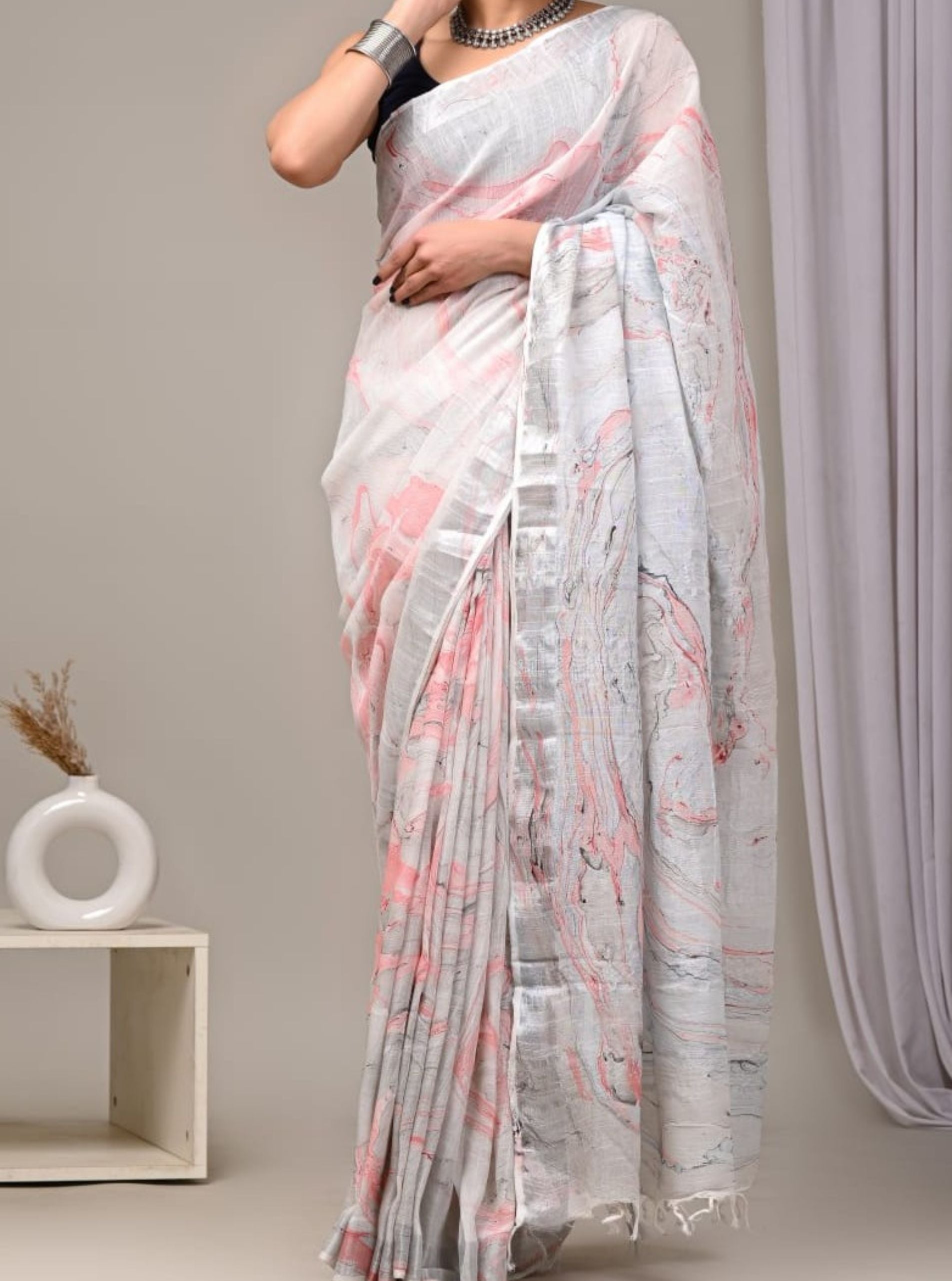 Grey Linen Cotton Saree with Soft Blush Marble Print