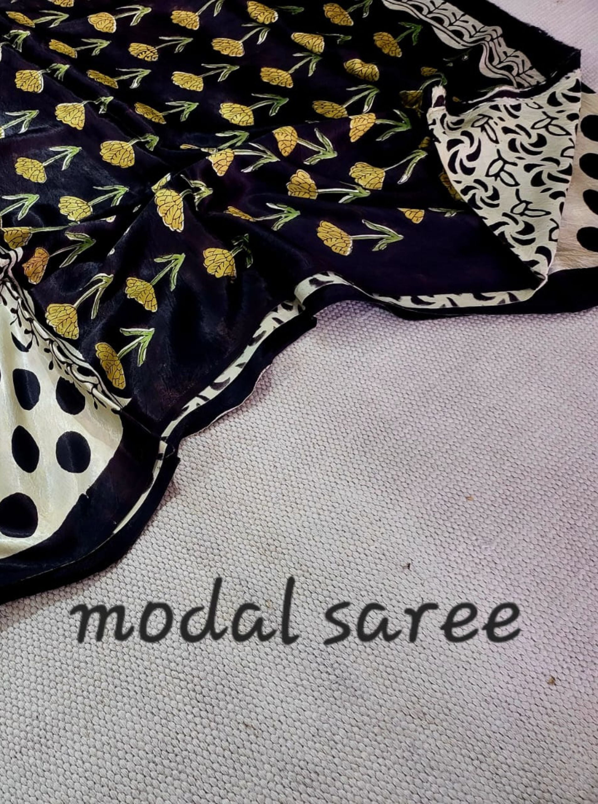 A striking blend of tradition and contemporary charm, this Modal Silk Ajrakh Saree showcases classic Ajrakh craftsmanship reimagined with bold polka motifs and delicate floral accents. The soothing ivory base contrasts beautifully with deep black and mustard hand-printed patterns, creating a saree that feels both timeless and modern.