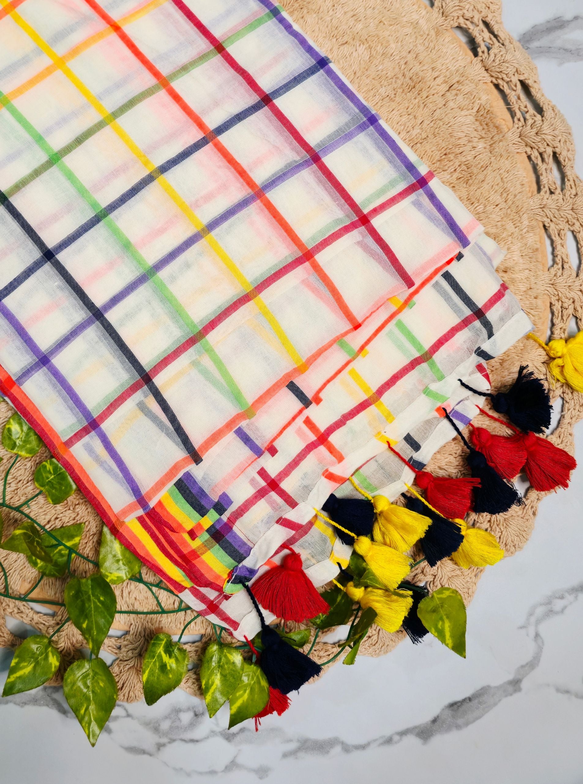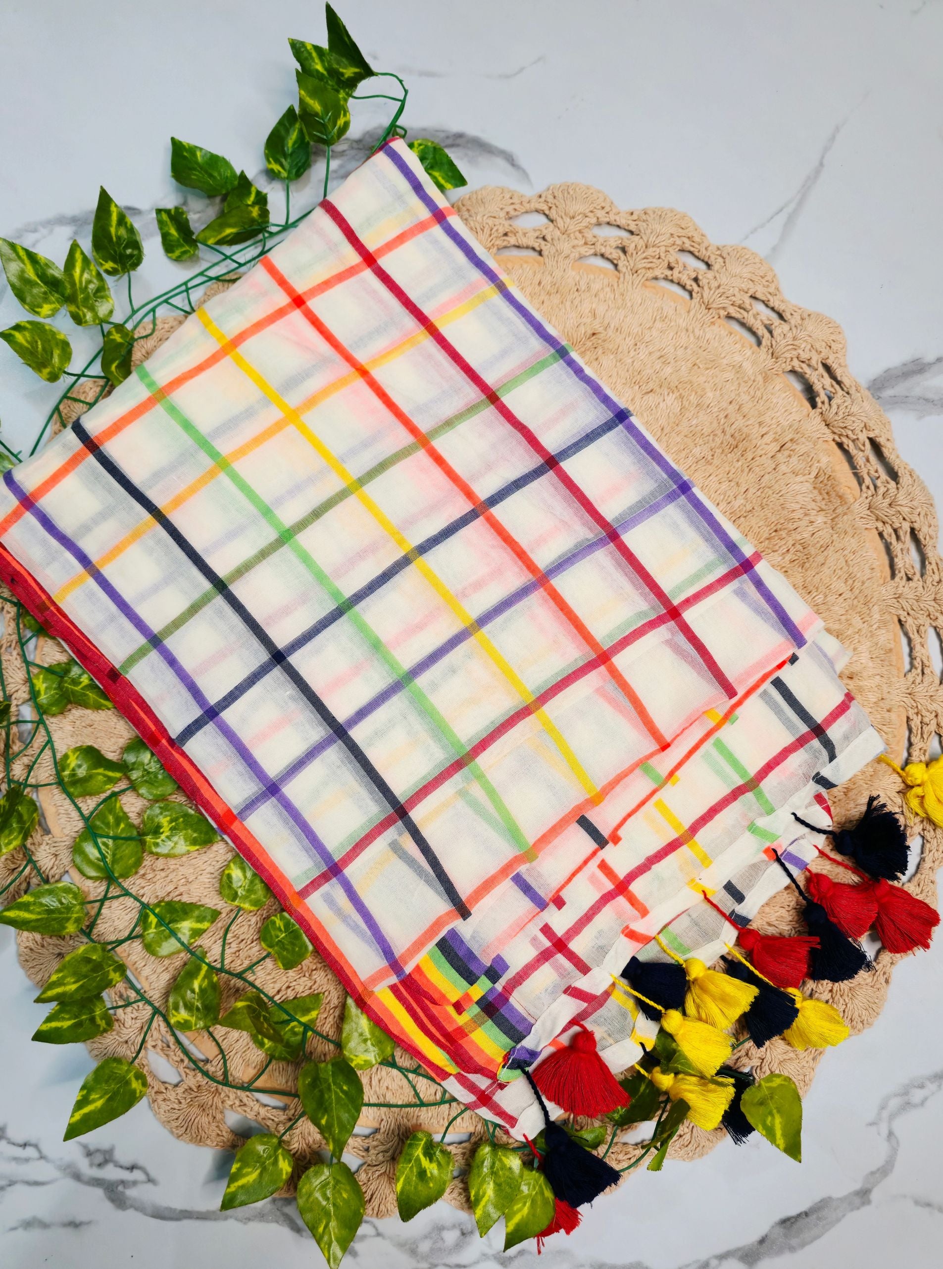 The subtle ivory base beautifully balances the vibrant grid lines, while the handcrafted tassels in red, yellow, and black lend a lively, artisanal finish to the pallu. Lightweight and easy to drape, this saree is perfect for everyday wear, summer outings, workwear, and casual ethnic styling.