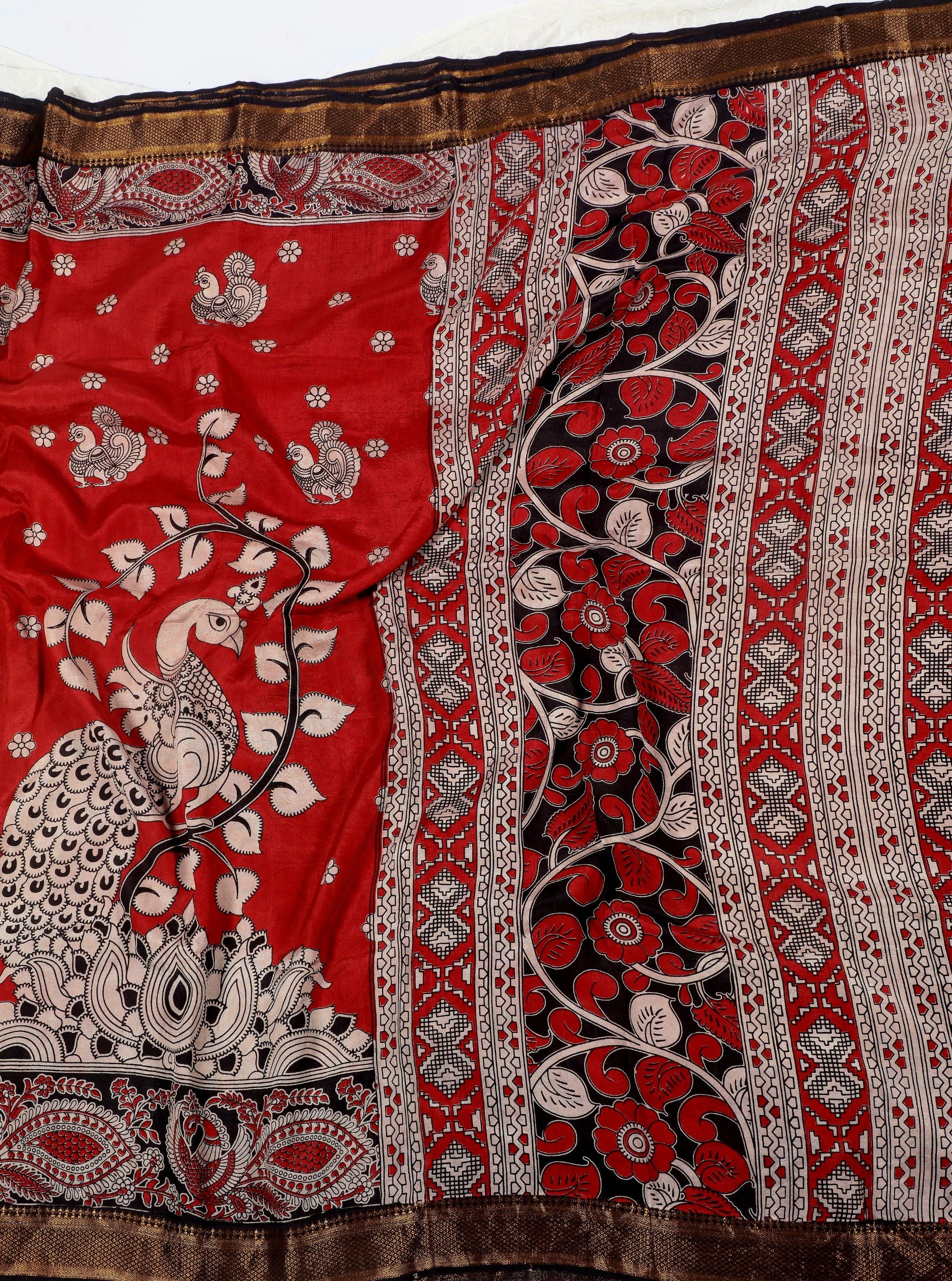 Red Kalamkari Mangalagiri Silk Saree with Peacock & Floral Motifs