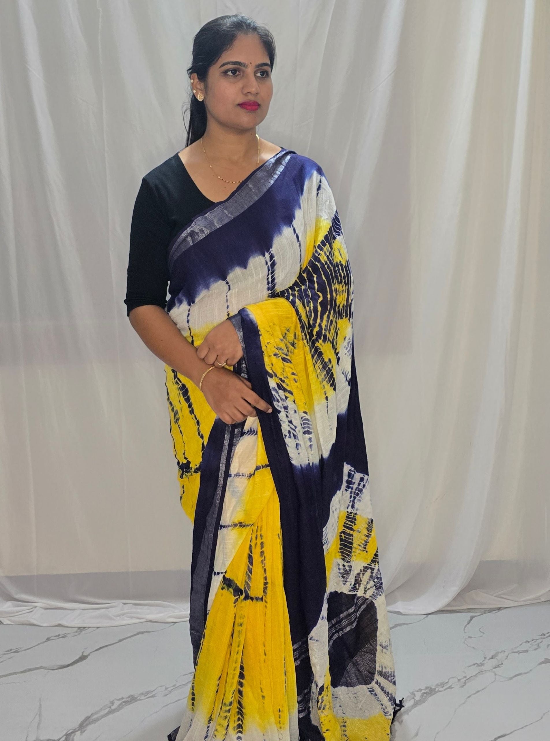 This elegant Linen Cotton Saree showcases a vibrant blend of sunny yellow, deep navy blue, and soft ivory tones, brought together through bold abstract tie-dye inspired patterns. The fluid, organic design creates a striking visual appeal while keeping the look effortlessly modern.